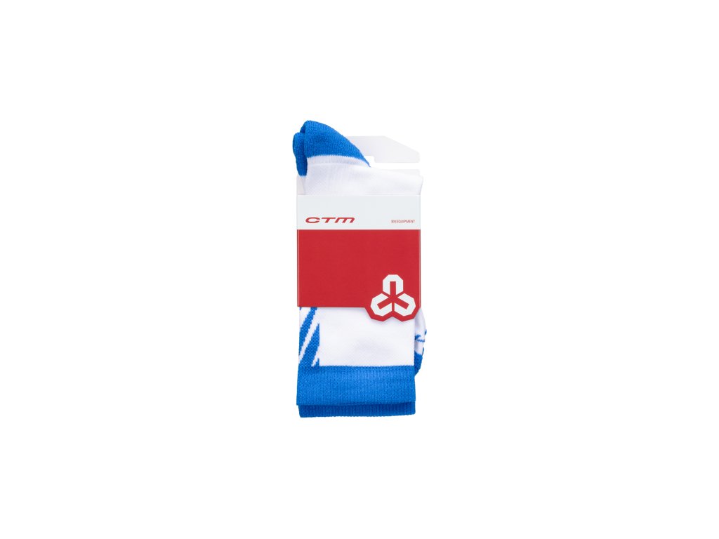 Technické ponožky z polyamidu; Tenké a prodyšné se semi-kompresním střihem; Zesílené v oblasti paty a špičky; Tlakové zóny v oblasti nártu a achilovky, které podporují proudění krve; Výška lýtka 18''; Velikost: 34–37; Materiál: Polyamid 93 %, Bavlna 7 %; Barva: bílo-modrá