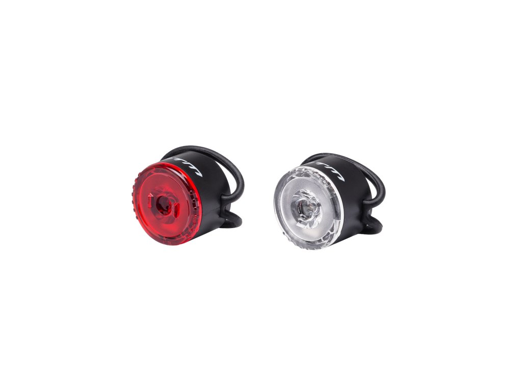"Sada mini osvetlenia; Jedna biela LED dióda (5lm), jedna červená led dióda (1,6 lm); Funkcie: blikanie - stále svetlo; Dlhá výdrž batérie - až 210 hodín; Univerzálne uchytenie pomocou gumových očiek; Obsahuje dve blikačky: biele a červené svetlo a batérie: CR2032x2; Rozmer: 30x24x30 mm; Farba: čierna"