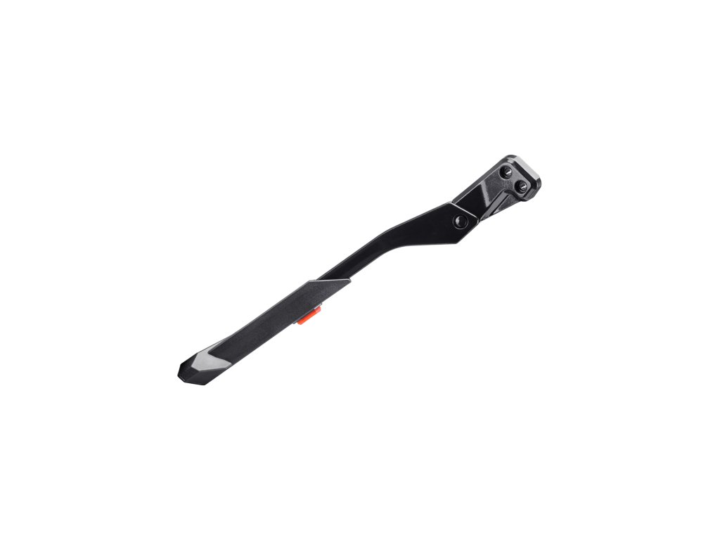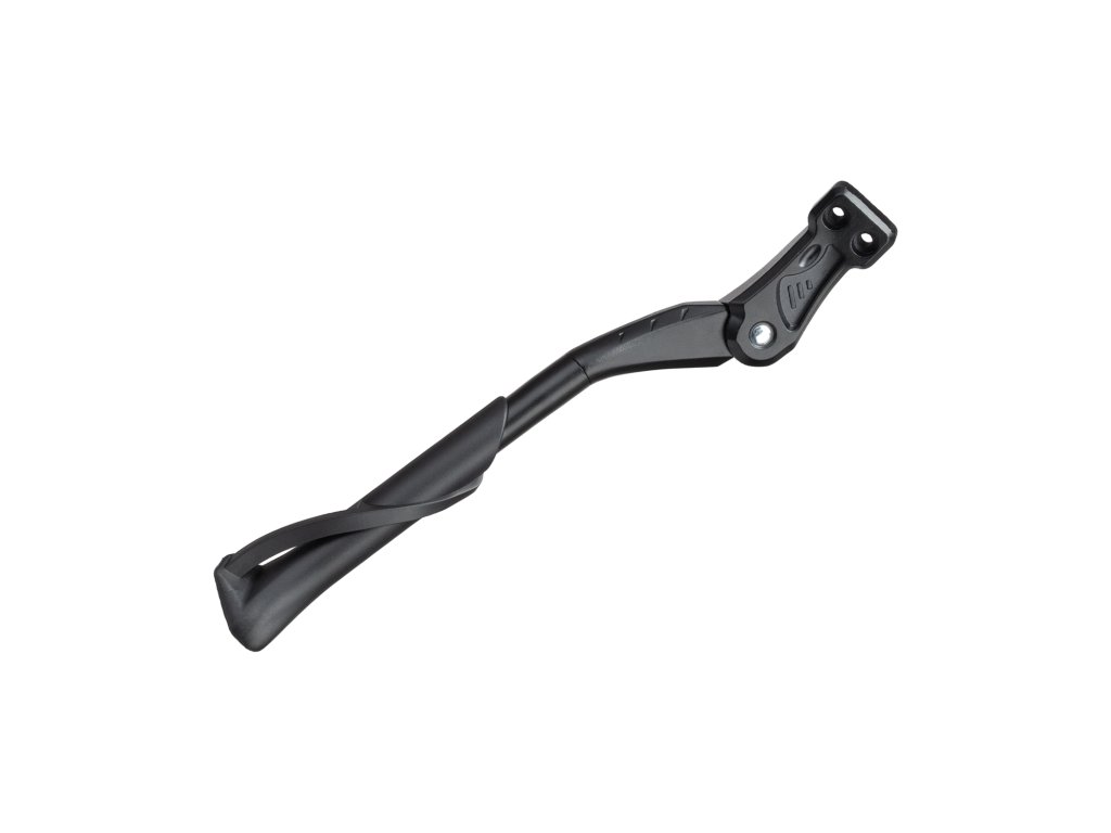 Hliníkový nastaviteľný stojan; Vhodný pre E-bike; Uchytenie na návarky zadnej stavby bicykla (18mm), na dve skrutky 5x20L; Vybratie: 10mm; Váha: 329g; Farba: čierna